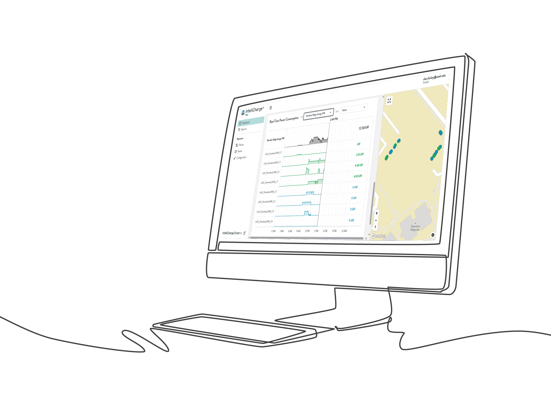 View real-time charger statuses, usage data, charging stations on a circuit, and performance metrics in one place.
